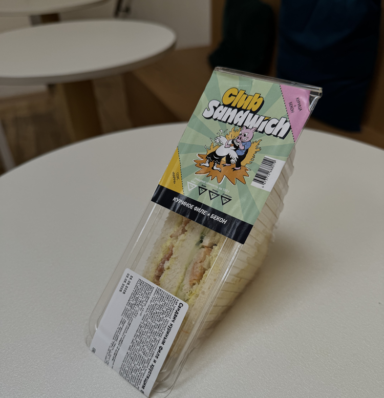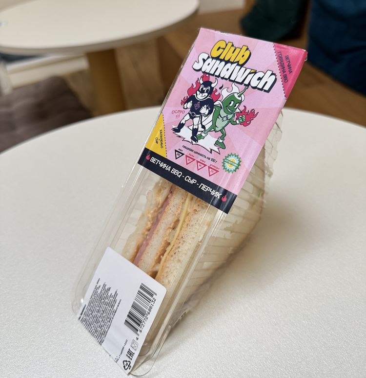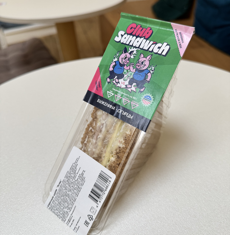Ржано-пшеничный тостовый хлеб, буженина свиная из тазобедренной части, сыр Гауда, лист салата, огурец свежий, соус Релиш из маринованных огурчиков с майонезом
