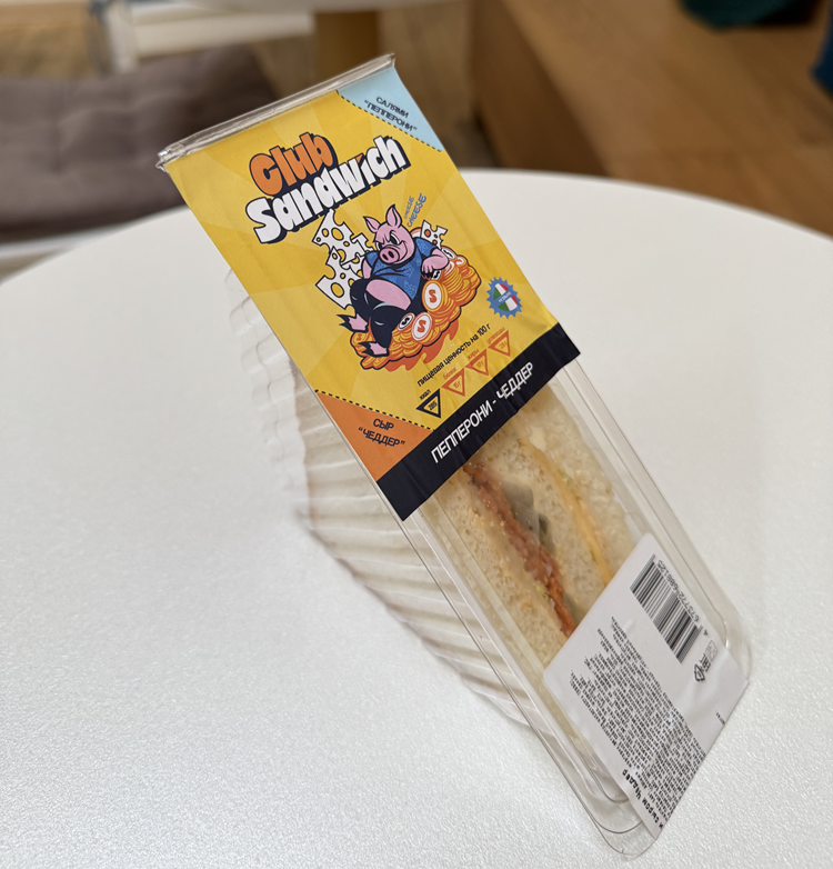 Пшеничный тостовый хлеб, салями пепперони, сыр Чеддер, лист салата, огурец маринованный, соус сырный майонезный